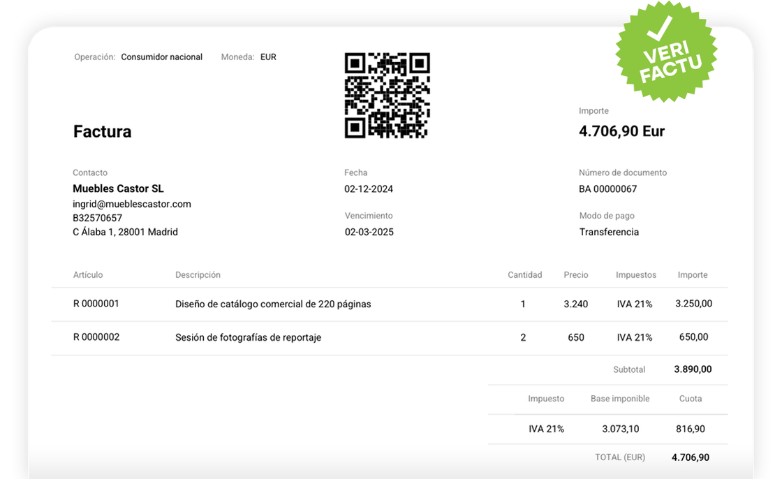 Se incrusta un código QR en la factura con el que tu cliente pueda verificar su autenticidad.