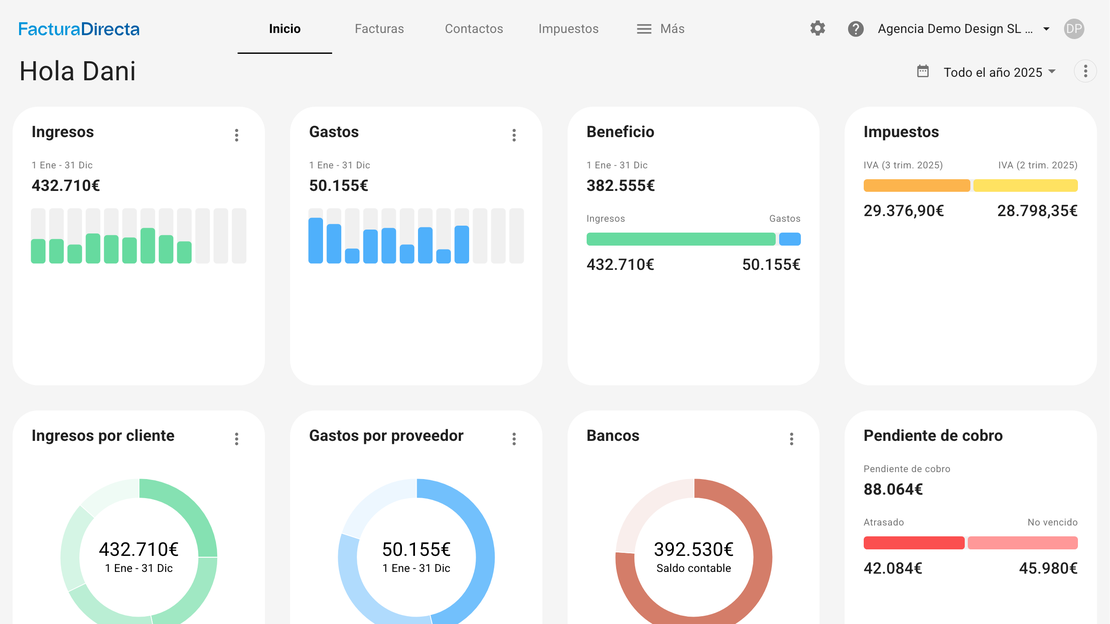 El dashboard evoluciona para darte una visión clara y personalizable de tu negocio. Ahora puedes mover, organizar y priorizar las tarjetas de inicio con los indicadores que más te importan: ingresos, gastos, beneficio, previsión de impuestos, cobros, pagos y más.