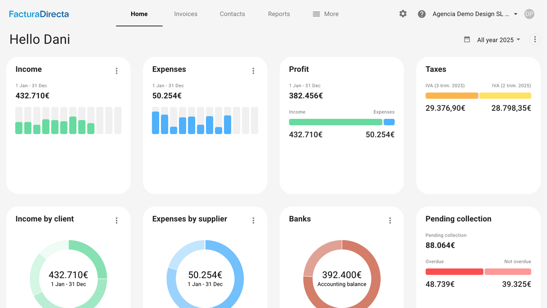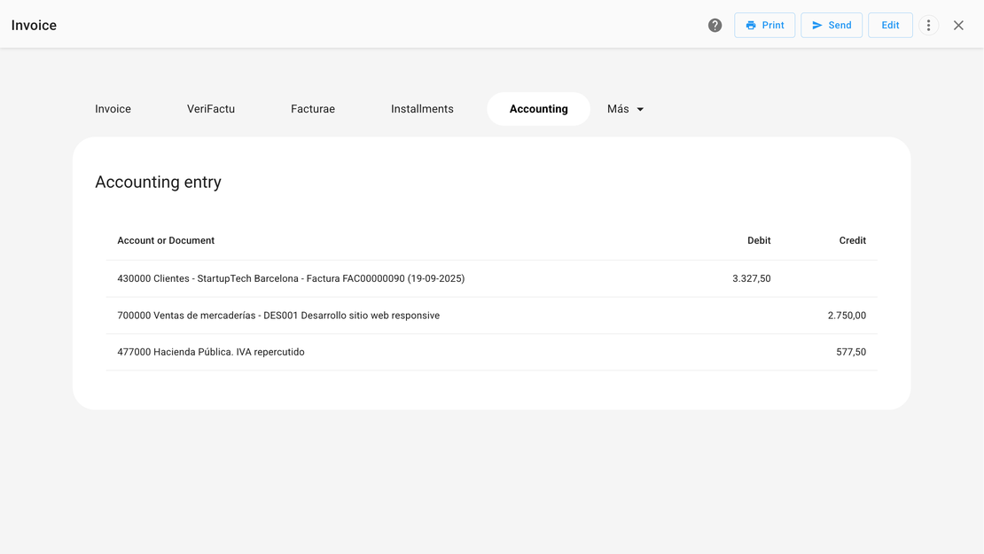 In FacturaDirecta, accounting is generated from your invoicing. If you modify an invoice, your accounting entry will also be modified. It’s that simple.