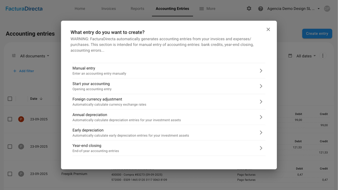 FacturaDirecta takes care of generating your entries based on invoicing, but you can generate manual entries whenever you want.
