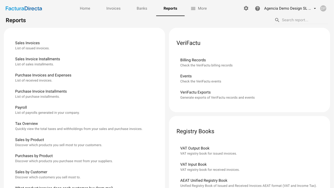Income tax withholding books, VAT books for issued invoices, VAT books for received invoices, journal and ledger. Also profit and loss reports, and trial balance. Plus the balance sheet.