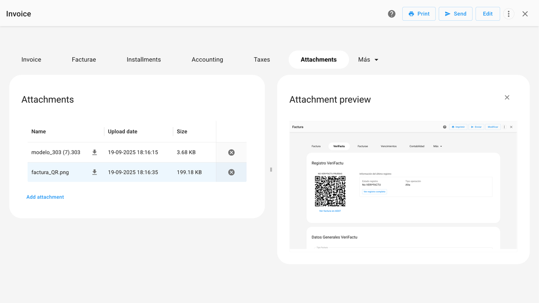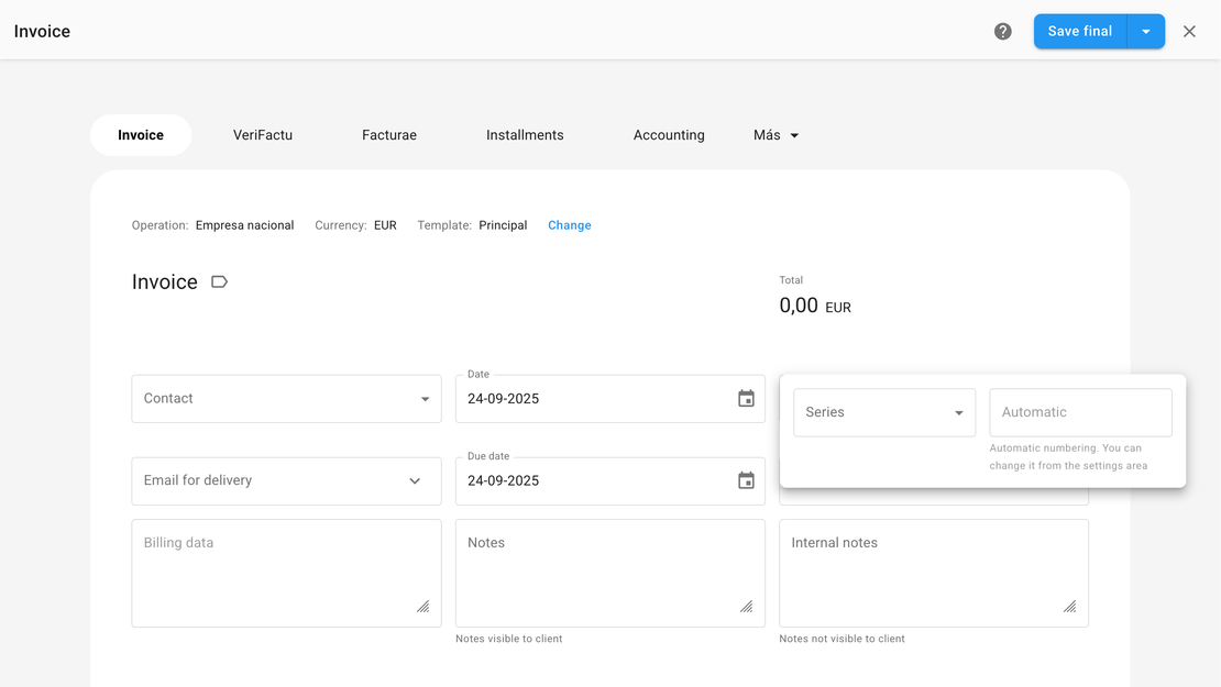 With FacturaDirecta the invoice number is generated and validated automatically. You’ll never have gaps in numbering or duplicate invoices again.
