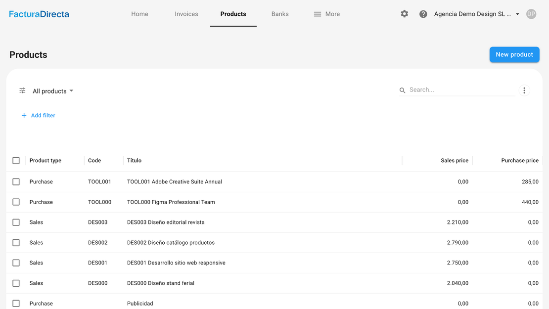 Create products and services with unit, description, selling price, tax type… everything you need to make invoices in a minute.